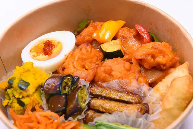 ハラル料理 OSAKAハラルムガルがご提供する宅配弁当。おすすめのインド風エビチリボウルDXをオフィスやご自宅でお楽しみください。中華よりも甘さ・こってりさを抑えスパイスの風味を活かしたインド風エビチリです。副菜は和洋アジアンを融合したそれぞれ味が違う7種類があり、食べ飽きないお弁当です。ロケ弁や会議など、ご利用シーンに合わせてデリバリーいたします。
