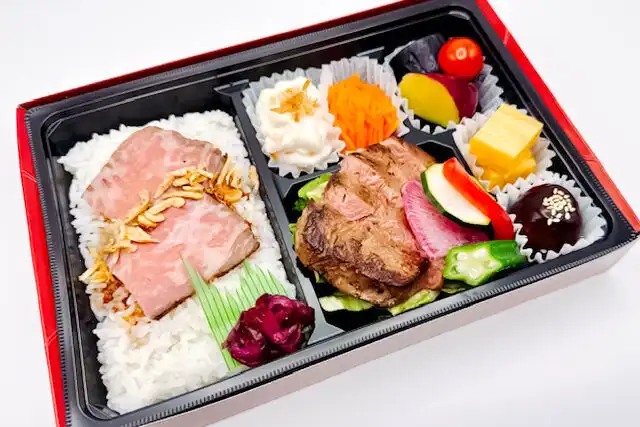 ご飯(150g)、黒毛和牛ローストビーフ、漬物、牛フィレステーキ、ステーキソース、茄子の揚げ浸し彩野菜添え、玉子焼、黒酢肉団子、惣菜2種
