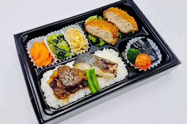 自家製の鰆西京焼きと黒毛和牛A5カルビステーキの贅沢なお弁当です。