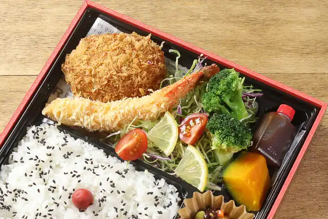 楽万極上クロケット&海老フライ弁当は麻布十番 楽万コロッケがおすすめする宅配弁当です。人気の牛肉たっぷりクロケットに、ぷりぷり甘い、女性人気ナンバー1、海老フライをトッピングしました。たっぷりレモンを絞ってお召し上がりください。ランチミーティングや特別なお集まりなど、ご利用シーンに合わせてデリバリーいたします。