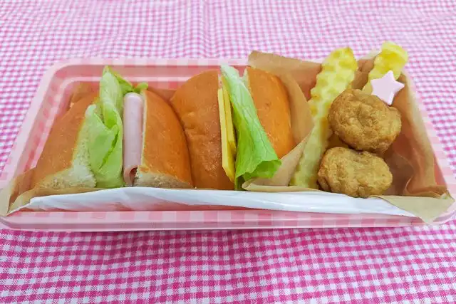 ハムサンド1個、チーズサンド1個、ミートボール2個、ポテトフライ3個