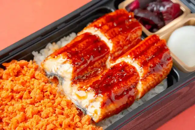 香ばしく焼き上げたうなぎと、旨み豊かな鮭のほぐしを贅沢に盛り付けたお重です。うなぎのコクと鮭のやさしい塩味が絶妙に調和し、彩りも美しく、最後まで飽きずに楽しめる満足感のある一品です。