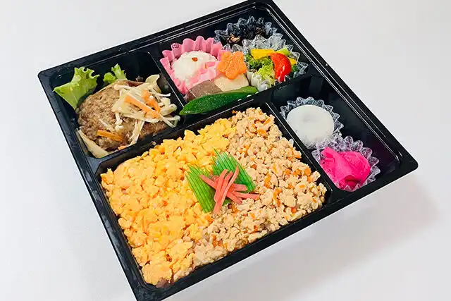 白米180g(鳥そぼろ、卵そぼろ)、ハンバーグ、煮物、副菜、1口デザート