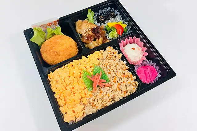 白米180g(鶏そぼろ、卵そぼろ)、カニクリームコロッケ、照り焼きチキン、副菜