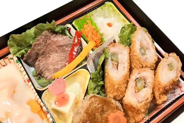 厳選された和牛と梅豚ロールフライを贅沢に、春の訪れを祝う彩り豊かなお弁当に仕上げました。