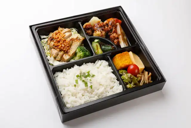 鶏肉のソテーもろみソース/鶏と野菜の黒酢あん/ピーマンのツナ和え/きのこポン酢/玉子焼き/しょうが風味の塩こんぶ胡瓜/大葉とじゃこ混ぜご飯[約200g]