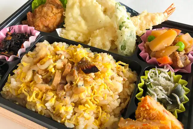 穴子飯(160g) / 天ぷら4種(海老、鱚、蓮根、スナックエンドウ) / 鶏の唐揚げ / 呉名物肉じゃが / 広島名物がんす天 / 胡瓜生酢ちりめんのせ / ひじきの煮物 / 広島菜漬け / 塩胡椒小袋