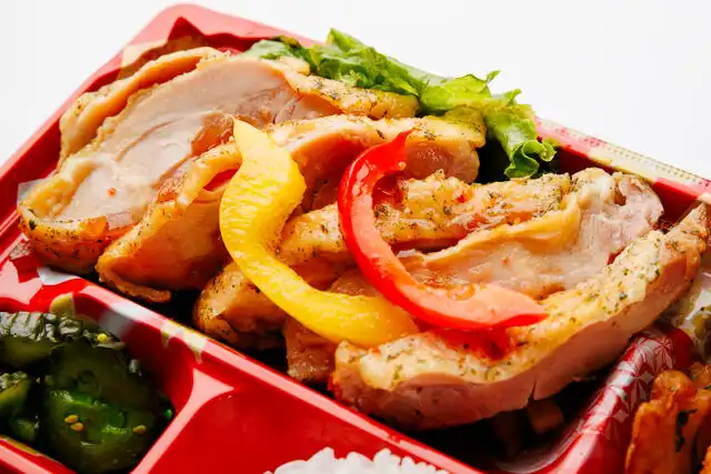 白米200g/チキンステーキ/ウインナー/ポテト/玉子焼き/煮物/漬物/梅干し/ごま
