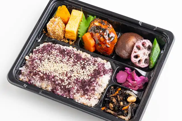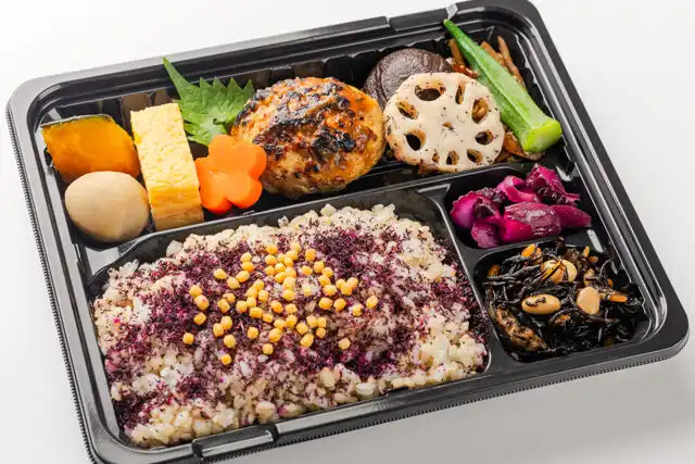 鶏つくね 仙台赤味噌照り焼き / 具沢山ひじき煮 / 里芋の煮物 / 白ごま風味 / 厚焼き玉子 / かぼちゃの煮物 / ゆかりレンコン / オクラ白出汁和え / 花人参 / 椎茸うま煮 / しば漬け / ゆかりあられ御飯220g
