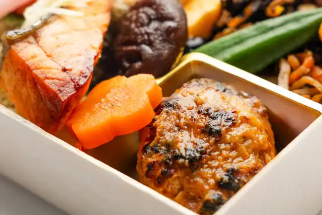 鶏つくね 仙台赤味噌照り焼き / 銀鮭の塩焼き〜針生姜添え〜 / 牛蒡の七味きんぴら / 具沢山ひじき煮 / 黒豆煮 / 厚焼き玉子 / かぼちゃの煮物 / ゆかりレンコン / オクラ白出汁和え / 花人参 / 椎茸うま煮 / はじかみ / 林檎と薩摩芋の芋きんとん / しば漬け / 昆布ご飯220g / 大葉 / 辛子明太子