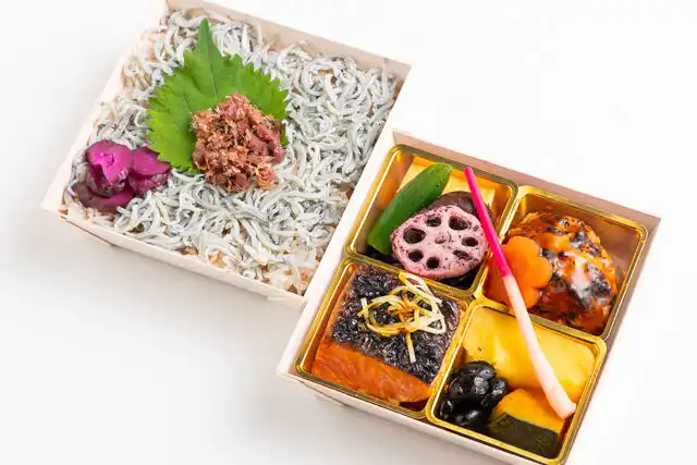 鶏つくね 仙台赤味噌照り焼き / 銀鮭の塩焼き〜針生姜添え〜 / 林檎と薩摩芋の芋きんとん / 具沢山ひじき煮 / 黒豆煮 / 厚焼き玉子 / かぼちゃの煮物 / ゆかりレンコン / オクラ白出汁和え / 花人参 / 椎茸うま煮 / はじかみ / 牛蒡の七味きんぴら / しば漬け / しらす / 大葉 / カリカリ梅おかか / ご飯220g