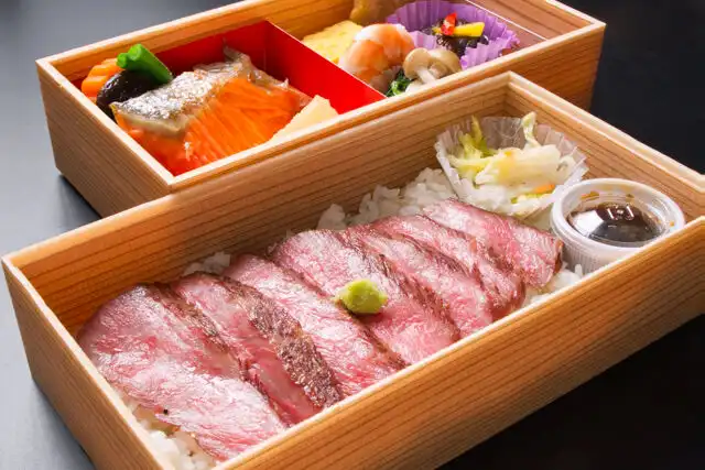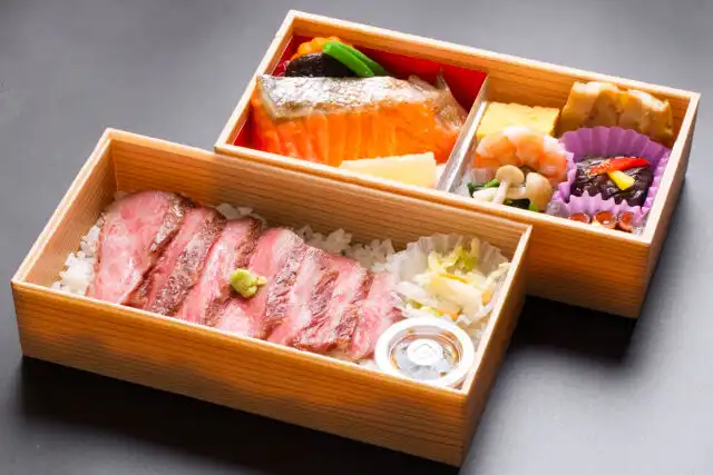 牛ステーキ/ご飯(約200g)・漬物/鮭腹身焼き(椎茸、人参、隠元、檸檬)/副菜(焼き穴子、茄子和風味、法蓮草・占地、海老白煮、蛸柔らか煮、卵焼き)