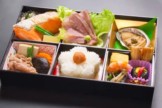 ご飯(約180g)、梅/牛すき焼き(焼き豆腐、長葱、椎茸、人参、隠元)/牛ステーキ/鮑酒蒸し肝ソース/特選鮭腹身焼き/副菜(焼き穴子、茄子和風味、法蓮草・占地、海老白煮、蛸柔らか煮、卵焼き)
