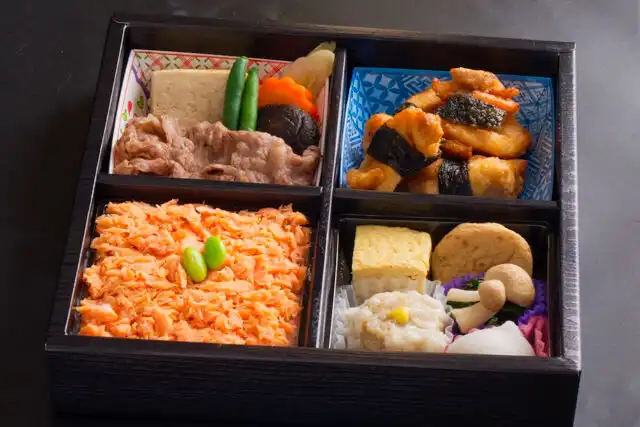 松花堂は十字で仕切った伝統的な和食の弁当。副菜もいろいろ。
