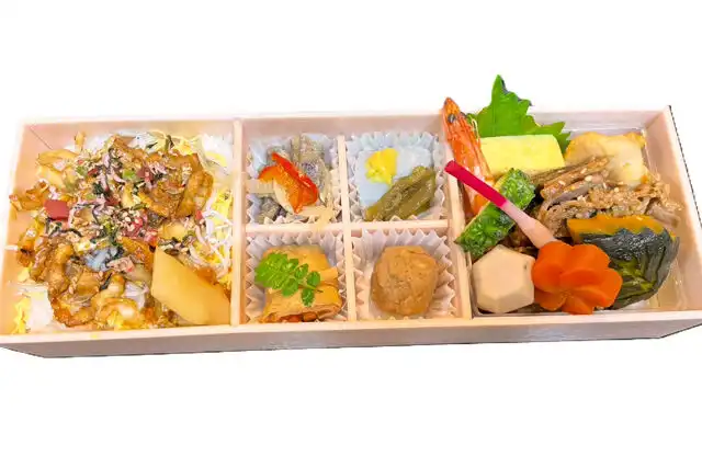 華やかな海鮮穴子ちらしと、香ばしい牛焼肉を一度に楽しめる贅沢なお弁当です。職人が手作りした彩り豊かな副菜と共に、色々な味を少しずつお楽しみいただけます。