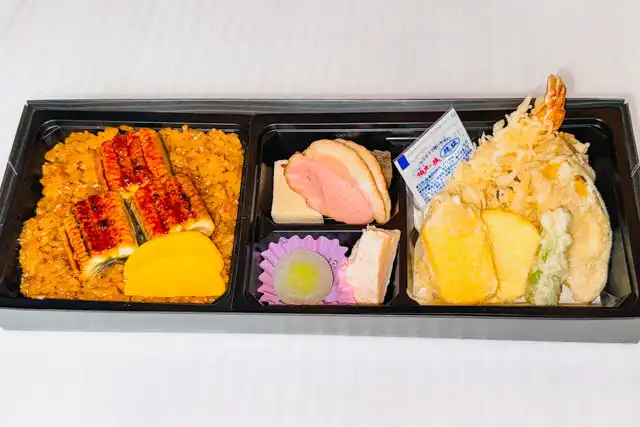 ごはん250g、鰻、海老の天ぷら、キスの天ぷら、野菜の天ぷら、海老真丈、甘味、漬物等