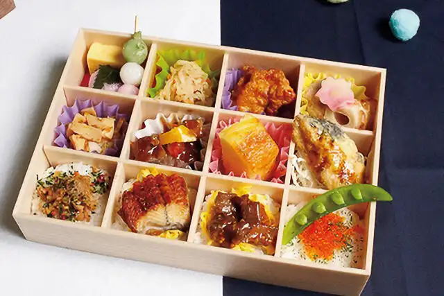 ご飯230g、唐揚げ、だし巻き、旬菜、副菜、甘味、鰻、牛肉のサイコロステーキ、牛しぐれ、煮物