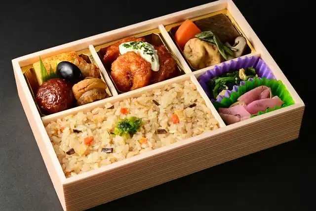 海老の甘酢あんかけ1ケ、鶏肉の甘酢あんかけ2ケ、タルタルソース / がんも、人参、れんこん、こんにゃくの煮物 / 玉子焼、さつまあげ、肉団子 貝桂旨煮、黒花豆 / ほうれん草粒ごま和え、大根しょうが酢物 / 炊き込みごはん 220g