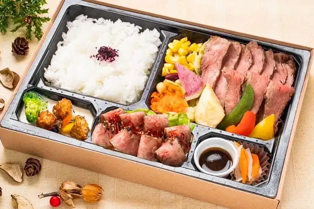 極選ビーフステーキがメインのお弁当!また特選黒毛和牛を特製タレで漬け込みローストビーフにして贅沢に。 和牛の味わいとオーガニックビーフの2種類を楽しめます。