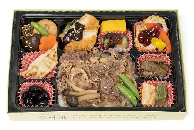 ご飯200g、三ケ日牛すき焼き、味噌カツ、浜松ぎょうざ、鶏天、黒豆、煮物、たたきごぼう、茄子おろしソース、厚焼玉子、わらび餅