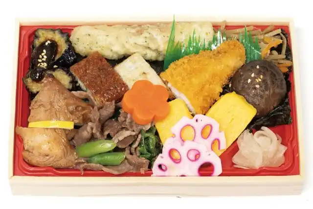 御飯240gうなぎ、しらす、セイゴ、天竜どんこ椎茸、三ケ日牛、浜名湖海苔、鶏の浜納豆焼き、厚焼玉子、ちくわ天ぷら、茄子田楽、きんぴらごぼう
