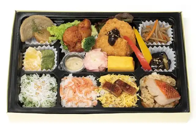 しらす飯(60g)、桜えび飯(60g)、うなぎ飯(60g)、金目飯(60g)、味噌カツ、静岡おでん、厚焼玉子、茄子田楽、きんぴらごぼう、わらび餅、鶏旨辛焼き、パプリカ、ワサビ漬け