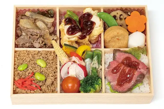 ご飯220g、三ヶ日牛焼肉、三ヶ日牛ローストビーフ、鶏天黒酢ソース、鶏そぼろ、煮物、グリル野菜