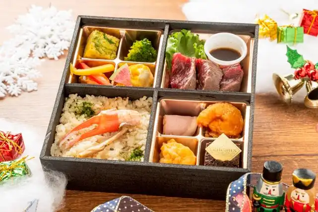 ズワイガニご飯180g/熟成厳選牛ステーキ/卵焼き/海老チリ/ブロッコリー旨煮/合鴨ロース/若鶏唐揚げ/鮭塩焼き/かぼちゃサラダ/シェフガトーショコラ