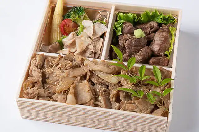 特選黒毛和牛のステーキ、焼肉、肉寿司が一度に味わえるこの御膳は、和牛の魅力を多角的に楽しむことができ、贅沢で特別なお弁当です。