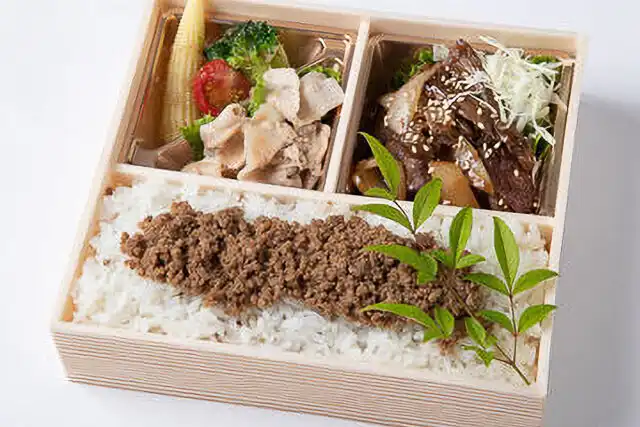 自家製の牛そぼろ重に、焼肉ハラミも堪能出来るお弁当です。副菜に豚のしゃぶしゃぶとサラダが付いた、肉づくしのお弁当です。