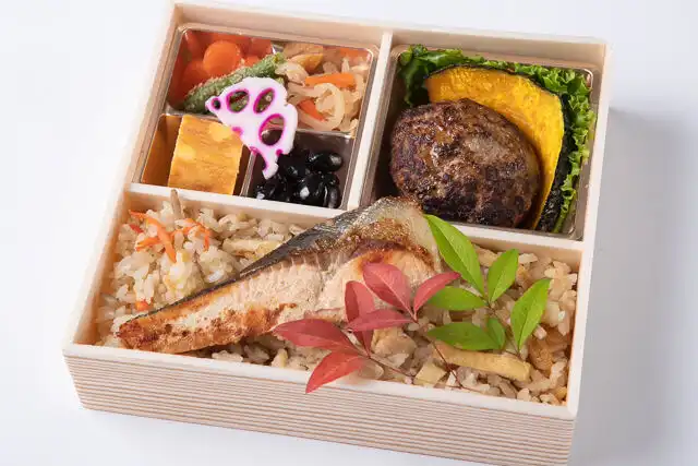 自家製のハンバーグとふっくらやわらかな季節の魚の西京焼きの入ったお弁当です。