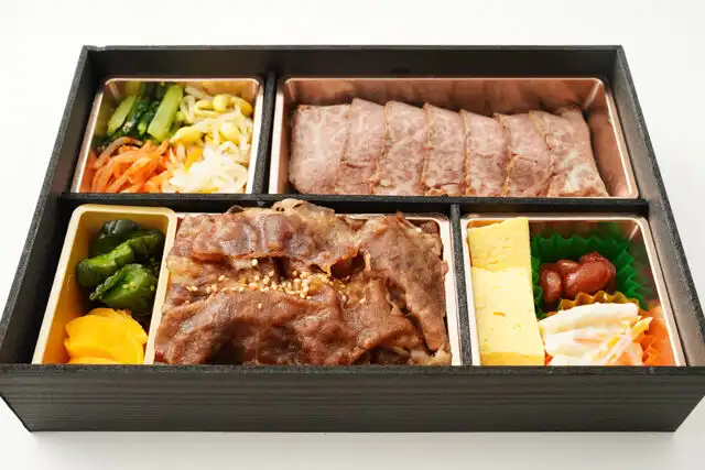 A5ランクの黒毛和牛を贅沢に使用し、ジューシーな旨味をそのまま閉じ込めた焼肉重と、しっとり柔らかなA5ランク黒毛和牛霜降りローストビーフを一度に味わえる贅沢なお弁当です。