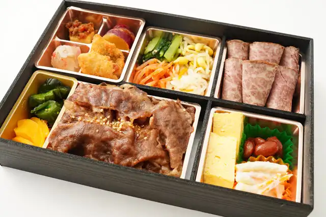 A5ランクの黒毛和牛を贅沢に使用し、ジューシーな旨味をそのまま閉じ込めた焼肉重と、しっとり柔らかなA5ランク黒毛和牛霜降りローストビーフに彩り豊かな副菜を添えた豪華なお弁当です。
