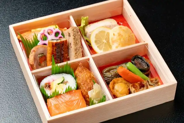 お寿司、焼き魚、鰻、海老真丈まで入った、新潟の味覚を満載に詰め込んだお弁当です。