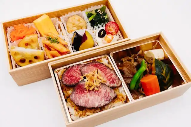 ご飯(150g)、黒毛和牛ローストビーフ、黒毛和牛すき焼き、一口がんも、季節の和え物、茄子の揚げびたし、さつま芋甘露煮、海老とトマトのポテトサラダ、パスタ、玉子焼、蓮根のはさみ揚げ、人参のラぺ