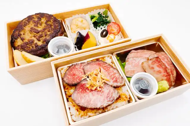 ご飯(150g)、黒毛和牛ローストビーフ、黒毛和A5カルビステーキ、ハンバーグ、フレンチフライ、ステーキソース、一口がんも、季節の和え物、茄子の揚げびたし、さつま芋甘露煮、海老とトマトのポテトサラダ