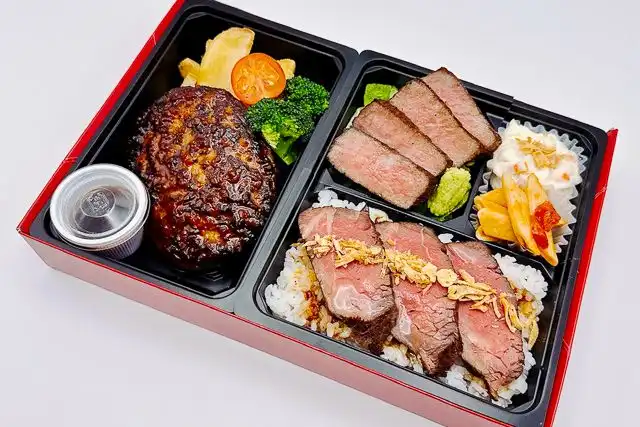 自家製の黒毛和牛ローストビーフと厳選した黒毛和牛のステーキに無添加特製ハンバーグのお弁当です。
