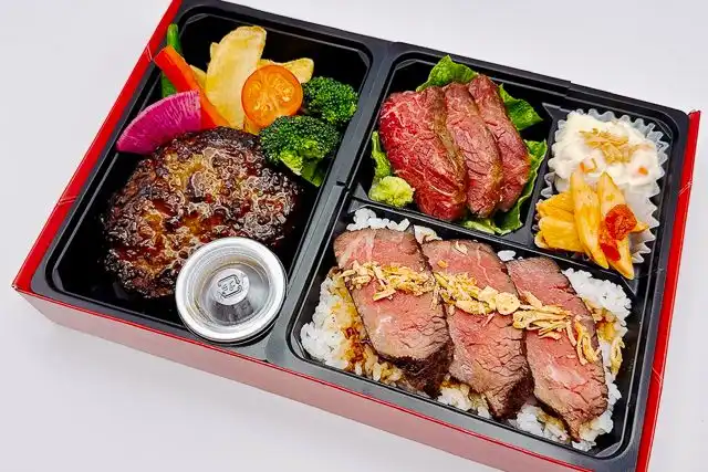黒毛和牛ローストビーフ、 ごはん(150g)、近江牛ハンバーグ、牛ハラミステーキ、ステーキソース、ポテトサラダ、トマトパスタ、フレンチフライ、添え野菜
