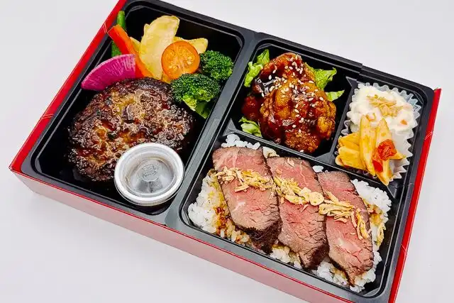 黒毛和牛ローストビーフ、 ごはん(150g)、近江牛ハンバーグ、黒酢唐揚げ、ステーキソース、ポテトサラダ、トマトパスタ、フレンチフライ、添え野菜