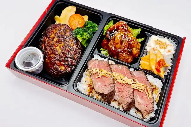 黒毛和牛ローストビーフ、 ごはん(150g)、無添加ハンバーグ、黒酢唐揚げ、ステーキソース、ポテトサラダ、トマトパスタ、フレンチフライ、添え野菜