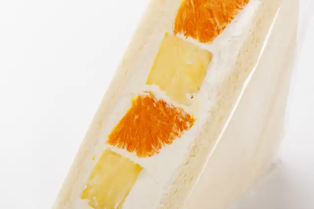 見た目も鮮やか!オレンジとパインのトロピカルな組み合わせ。パンの後ろまでフルーツやクリームがぎっしり詰まっています。ホイップクリームはクリームチーズが入っていて、さっぱりと食べられます!※サンドイッチは、保冷袋・保冷剤を使用してお届けいたします。