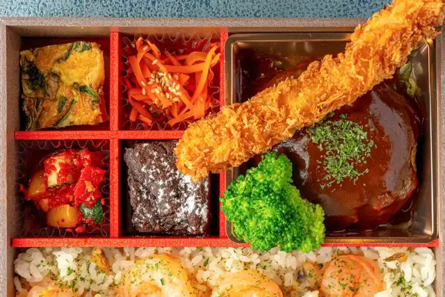 【ごはん】エビピラフ250g、パセリ【おかず】ハンバーグ、エビフライ、季節のラタトゥイユ、キャロットラペ、ガトーショコラ、季節のオムレツ