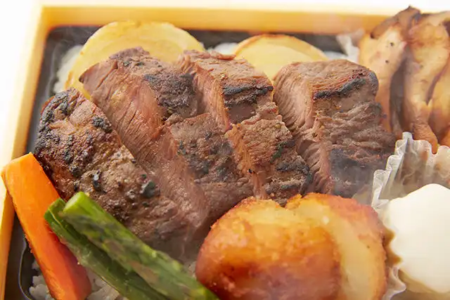 白米、道産牛ヒレステーキ、フライドポテト、アスパラ、にんじん、オニオンソテー