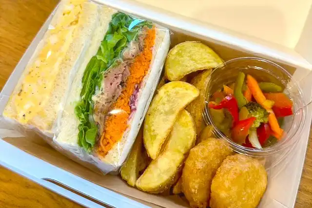 【ローストビーフ】食パン/粒マスタード/グリーンリーフ/ローストビーフ/人参ラペ/レッドキャベツ/マヨネーズ【たまごサンド】食パン/たまごサラダ【付け合わせ】フライドポテト/チキンナゲット/ピクルス(パプリカ、ブロッコリー)