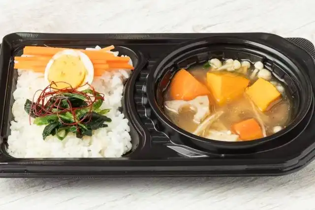 白ご飯200g、人参ナムル、玉子スライス、ほうれん草ナムル、 蓮根冬瓜煮込み