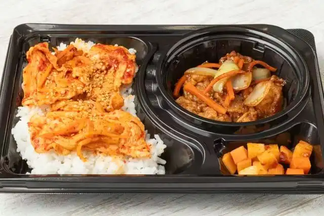 白ご飯200g、豚バラ甘辛ダレ焼肉、豚溜肉段炒め、大根人参漬物