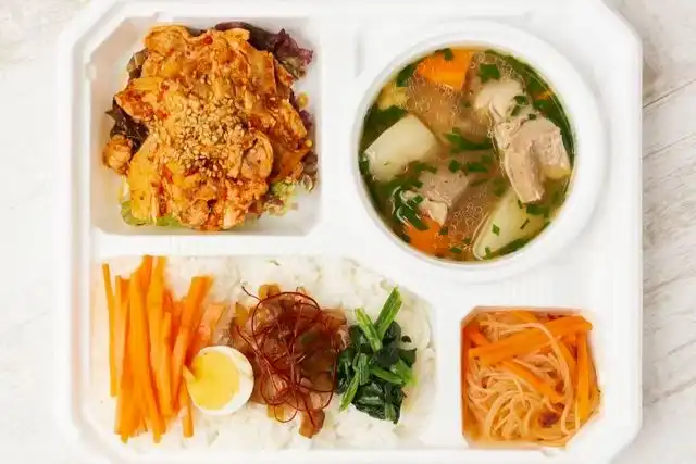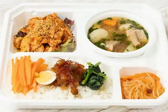 白ご飯200g、人参ナムル、玉子スライス、玉葱炒め、ほうれん草ナムル、豚バラ甘辛ダレ味焼肉、牛角煮込み、春雨