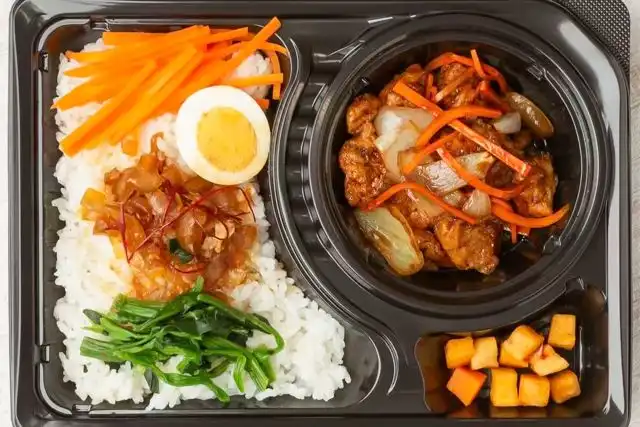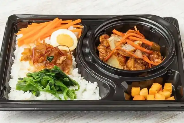 白ご飯200g、人参ナムル、玉子スライス、玉葱炒め、ほうれん草ナムル、中華豚バラ肉溜肉段炒め、大根人参漬物