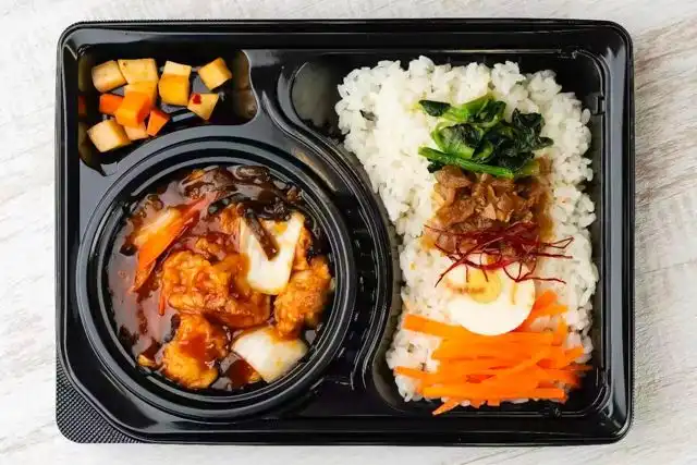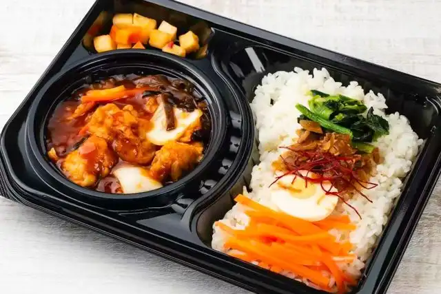 白ご飯200g、人参ナムル、茹で玉子、玉葱挽肉炒め、ほうれん草ナムル、中華酢豚炒め、大根人参漬物