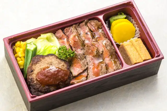 黒毛和牛を100%使用したハンバーグと伊勢重吟選国産牛(交雑牛)のサーロインステーキを組み合わせたお弁当です。